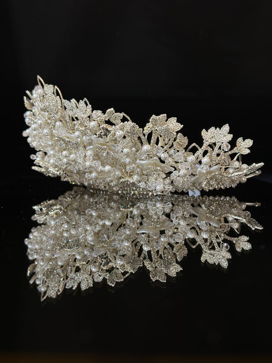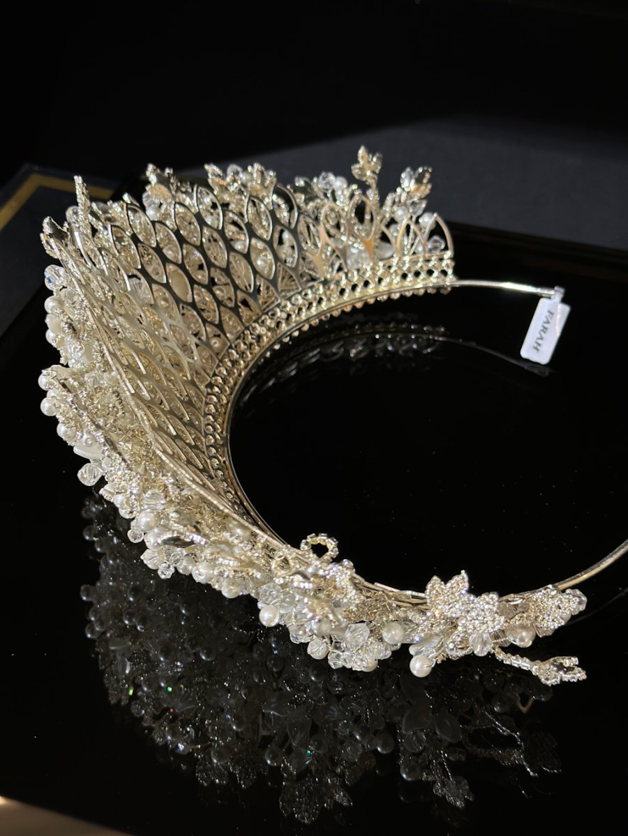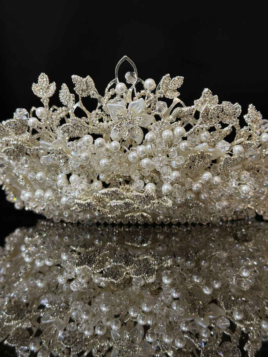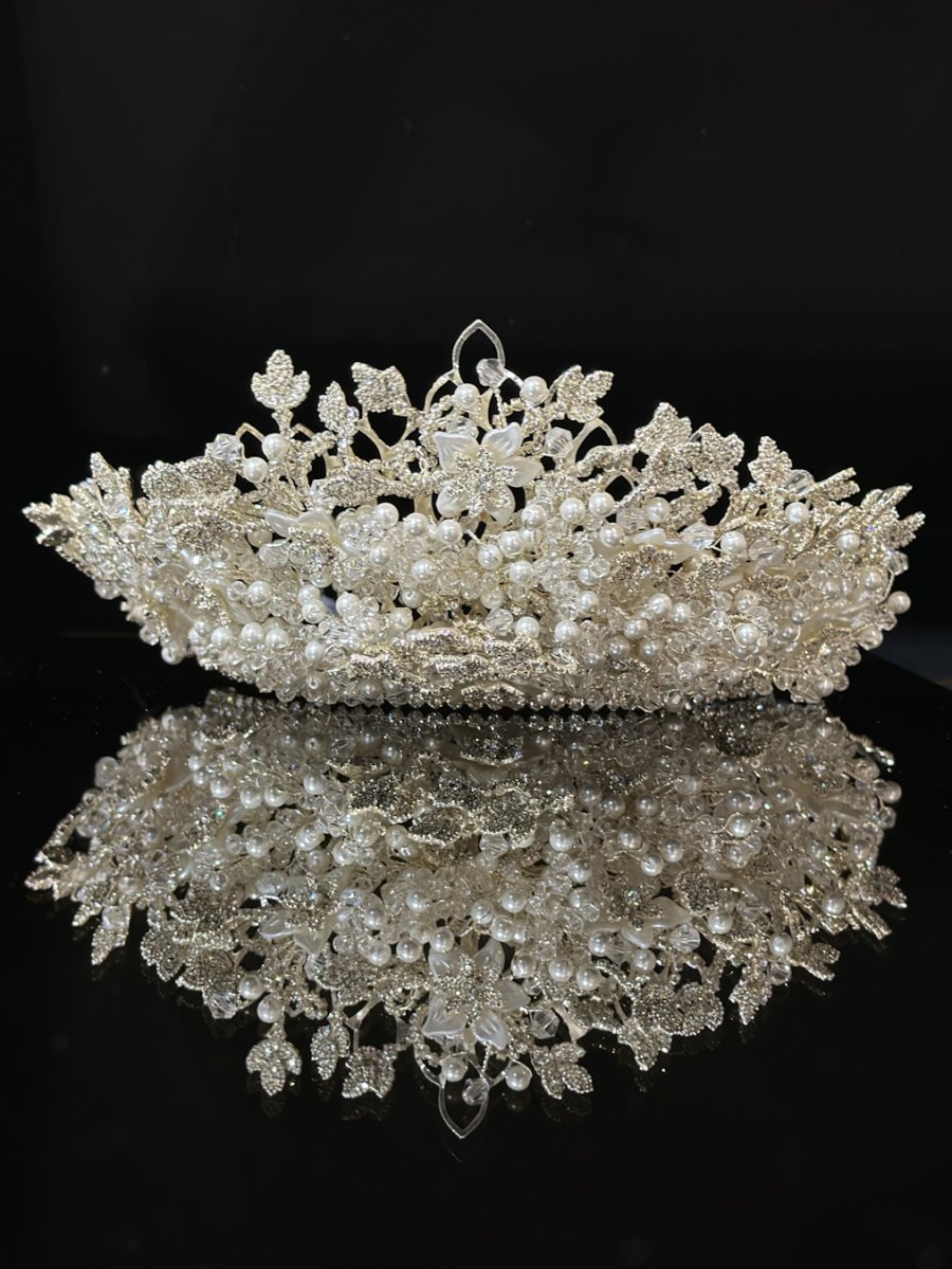 تاج مرصع بأحجار الزركون واللؤلؤ باللون الفضي
