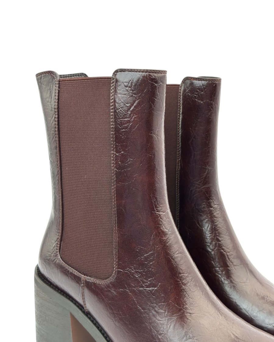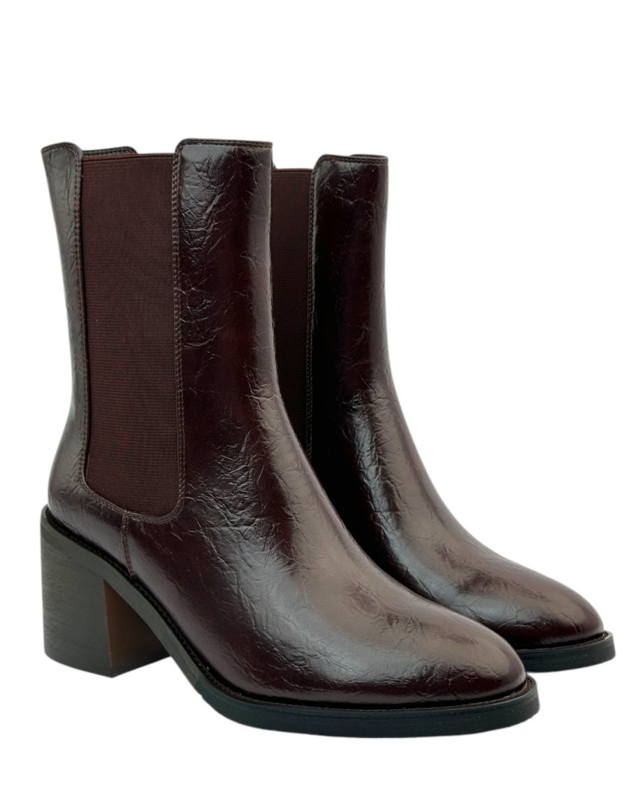 بوت تشيلسي نسائي بكعب عريض - جلد مجعد - لون عنابي غامق.
