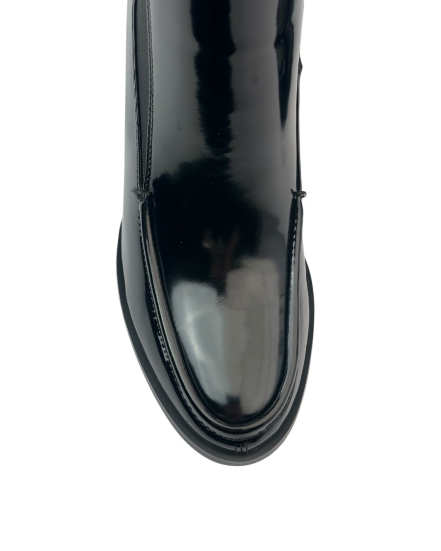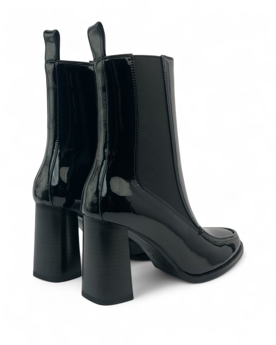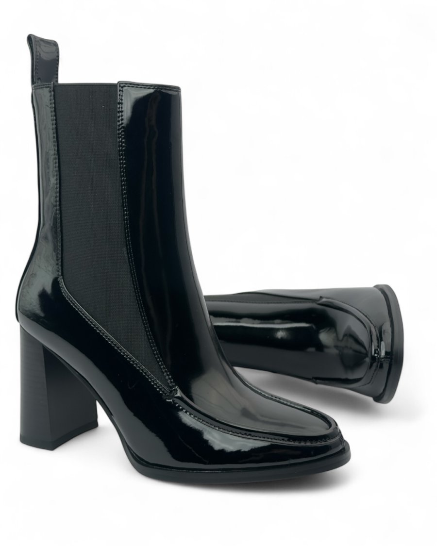 بوت تشيلسي نسائي - جلد لامع أسود - كعب عريض ومقدمة مربعة.