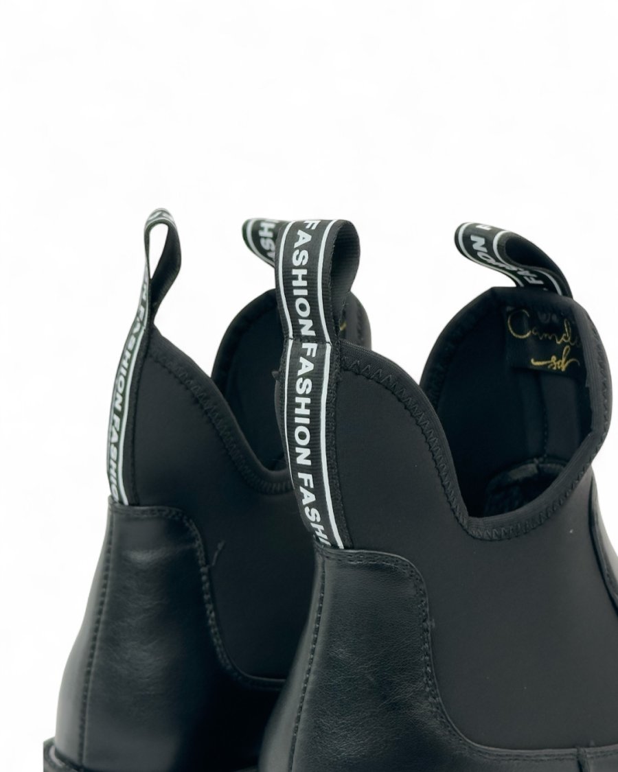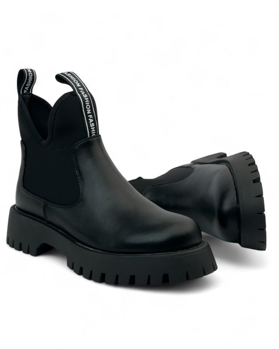 جزمة تشيلسي جلد أسود بنعل مسنن وشريط مطاطي جانبي.