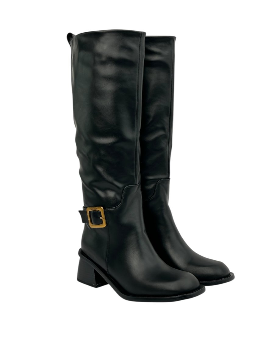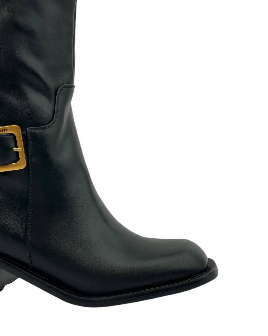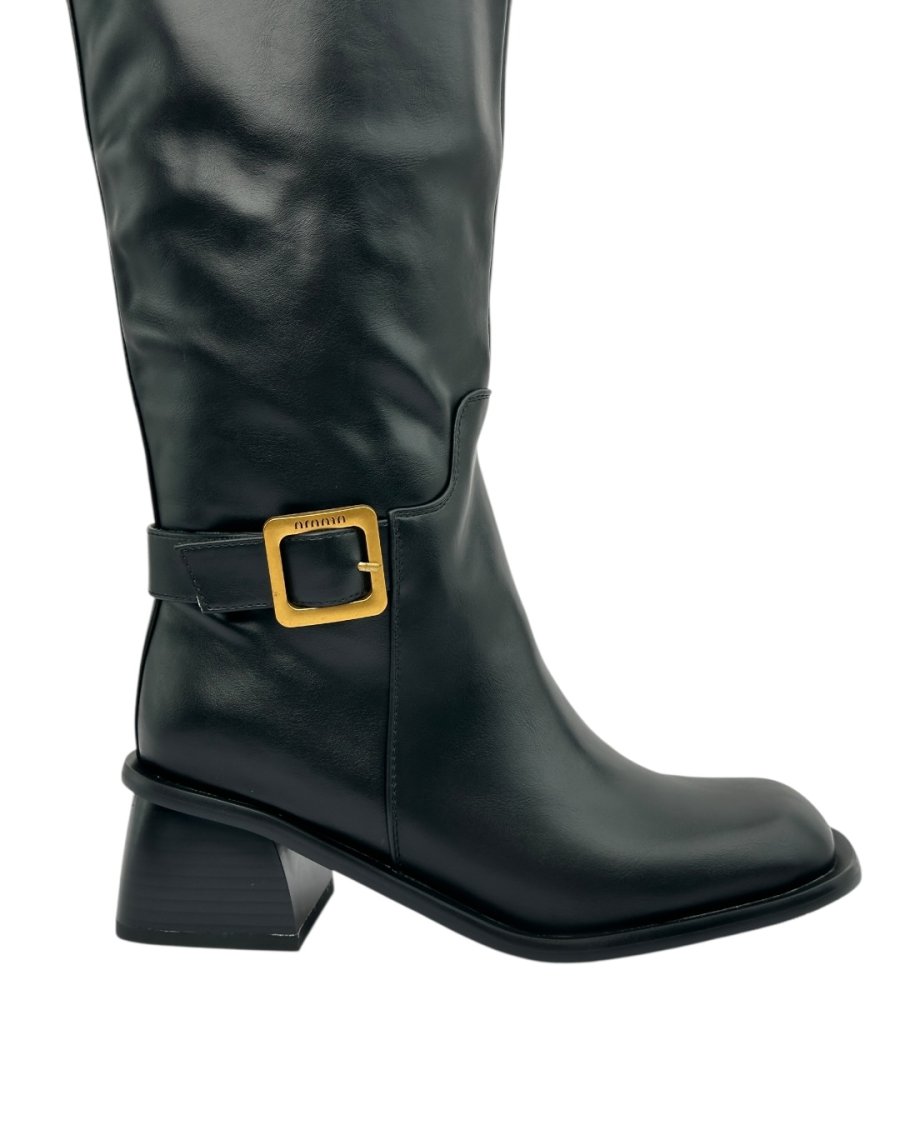 جزمة طويلة جلد أسود بمقدمة مربعة وكعب عريض وحزام بإبزيم ذهبي