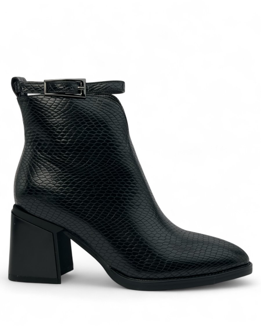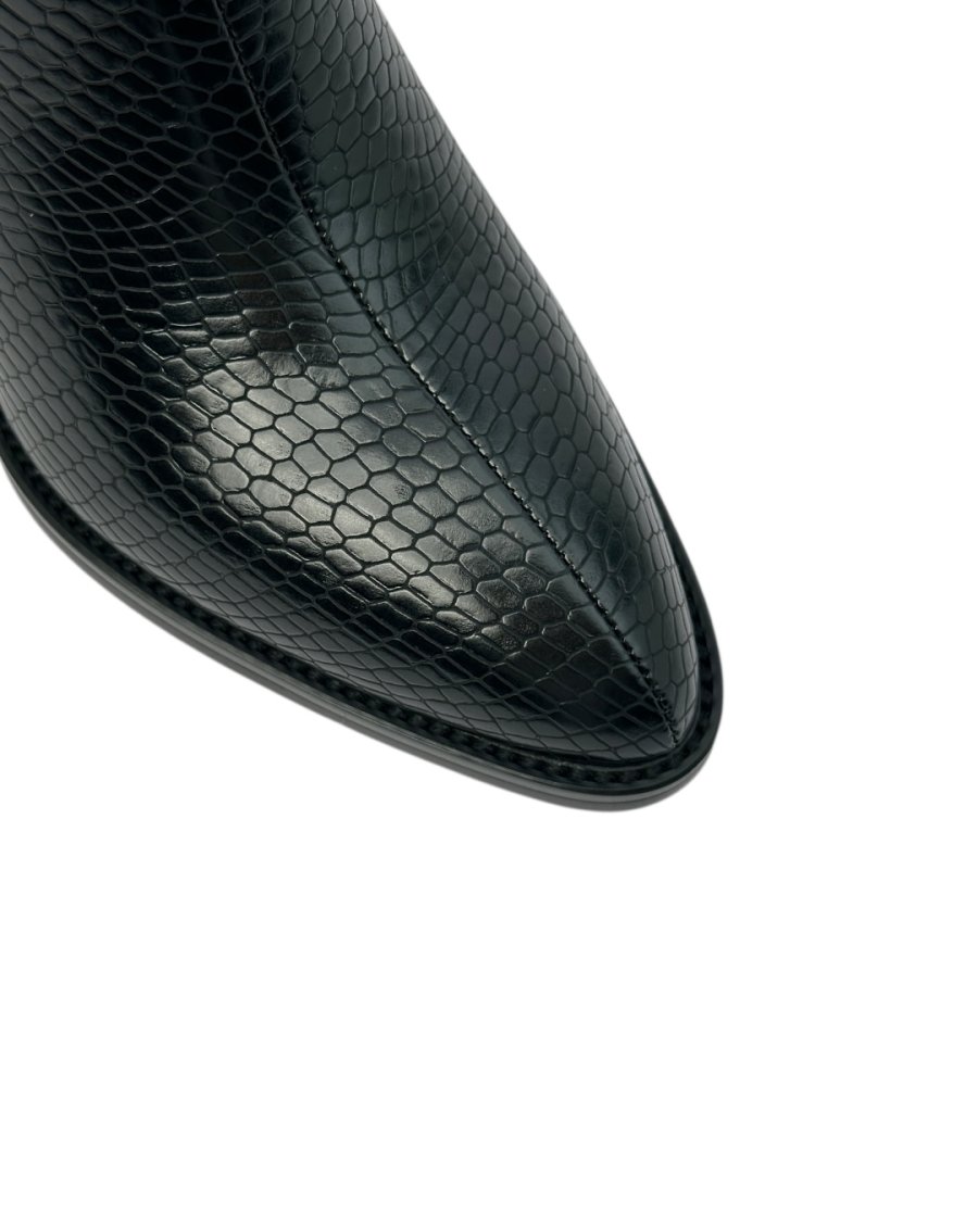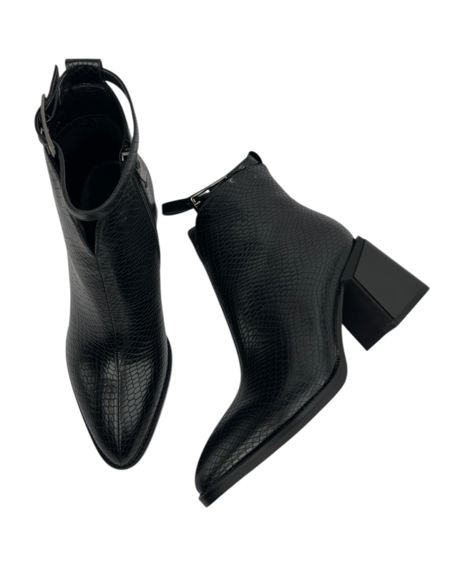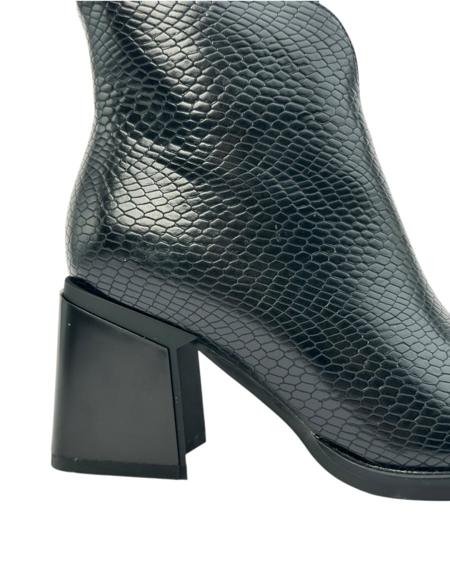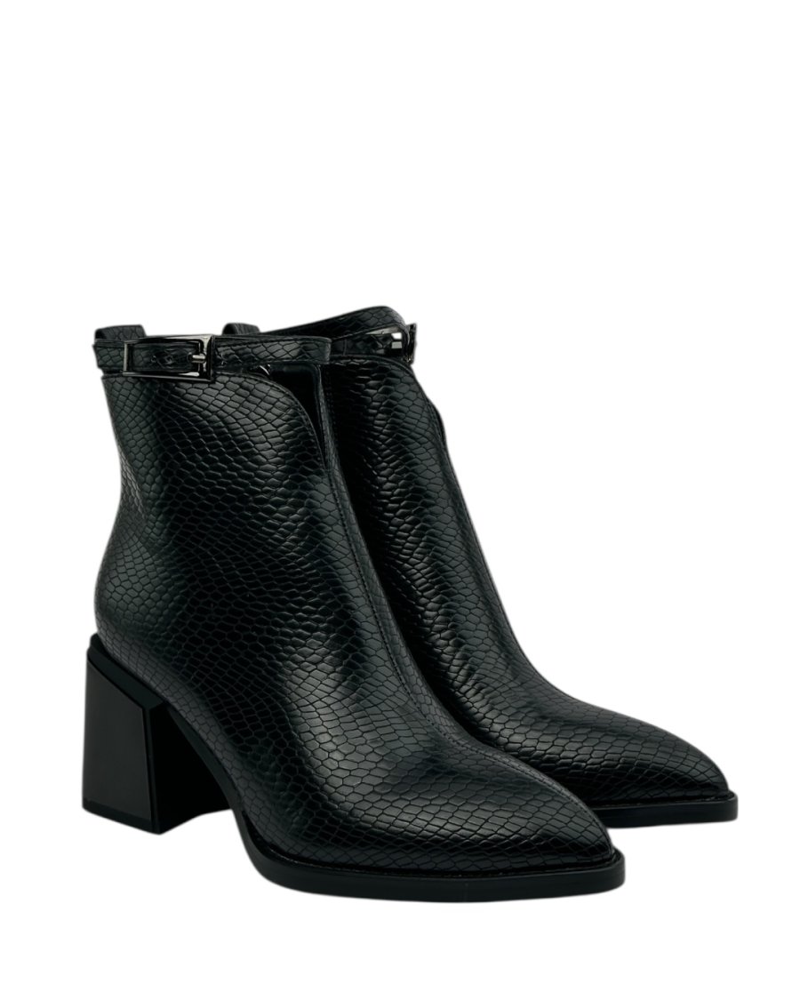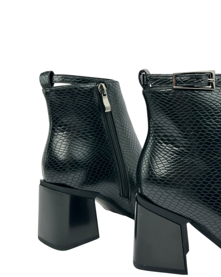 جزمة كاحل جلد أسود نقشة ثعبان بمقدمة مدببة وكعب عريض